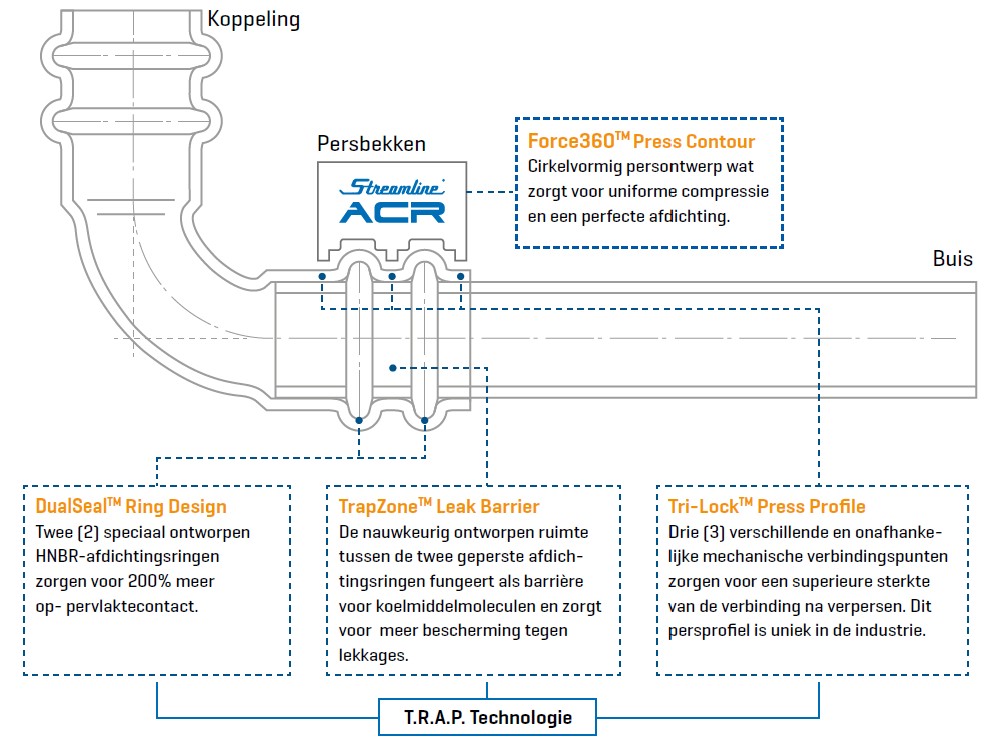 Onze DualSeal™-technologie zet een nieuwe standaard in lekdichtheid, met niet één, maar twee afdichtingen aan elke kant wat een dubbele veiligheid garandeert. Met meer oppervlaktecontact en een nauwkeurig ontworpen T.R.A.P.-zone bieden onze koppelingen een ongeëvenaarde bescherming tegen lekkage van koelmiddelen. Bovendien, is er geen verwarring (met sanitaire fittingen) mogelijk. Koelmiddelmoleculen zijn minuscule en gecombineerd met de hoge druk moeilijk op te vangen. Daarom ontwikkelde het team het vooruitstrevende DualSealTM -design. De tweede afdichtingsring en de ruimte ertussen fungeren als een secundair afdichtingsmechanisme. Het resultaat is een HVACR-perssysteem met een ongeëvenaarde lekbestendigheid.